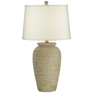 Show more Illuminate your space with the stunning John Timberland Austin Table Lamp, a perfect blend of functionality and artistic design. This impressive lamp stands at 28 inches high, making it an ideal addition to any table, nightstand, or console. The lamp boasts a unique ceramic pottery look that adds a southwestern flair to your decor, exuding charm and warmth with its sand tone finish and ridged cast resin construction.