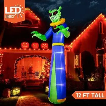 Show more Transform your Halloween festivities with the Joiedomi 12 FT Tall Halloween Inflatable Outdoor Decoration, a stunning blend of whimsy and fright. Standing at an impressive 12 feet, this giant inflatable features a captivating wizard alien design complete with striking red LED eyes that glow beautifully in the dark. Crafted with meticulous attention to detail, it not only serves as a fantastic focal point for your outdoor decorations but also invokes an eerie yet fun atmosphere that will enchant passersby. Perfect for yards, gardens, or any outdoor space, this inflatable creation ensures that your Halloween celebration stands out and impresses all who see it.