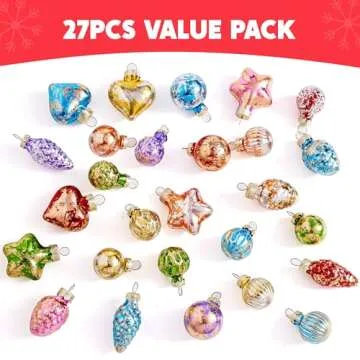 Show more Introduce a touch of nostalgia and a burst of color into your holiday decorations with our exquisite set of vintage glass ornaments. Each set contains 27 carefully crafted pieces featuring an assortment of delightful designs including stars, pine cones, balls, hearts, and onion ornaments. Measuring approximately 0.9-1.7 inches high, these vibrant accents are perfect for illuminating your Christmas tree, wreaths, or seasonal displays.