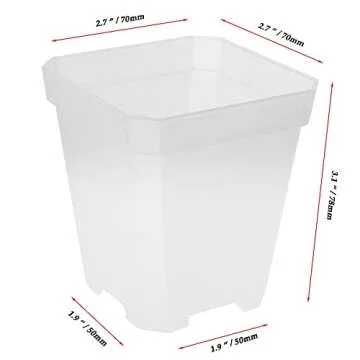 Show more Discover the ultimate solution for all your planting needs with these high-quality square nursery pots, designed to simplify your gardening journey. Made from durable and lightweight plastic, these pots are perfect for both indoor and outdoor use, ensuring your plants thrive in any environment. Each pot measures 3.1 inches tall and features a 2.7 x 2.7-inch top and a narrower bottom of 2x2 inches, allowing for efficient plant organization without taking up excess space.