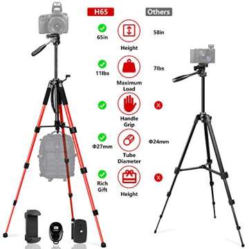 JOILCAN 65” Camera/Tablet/Phone Tripod, Aluminum Lightweight Tripod Stand 11 lbs Load with Universal Phone/Tablet Mount,2PC Quick Plates for Cannon Nikon Camera,IPAD and iPhone(Red)