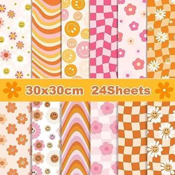 JOINFANXIN Boho Daisy Face Checkered Gift Scrapbook Paper Pad - 24 Pcs Retro Groovy Checkered Decorative Craft Double-Sided Decopodge Cardstock for DIY Decorations & Cardmaking