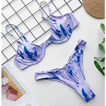 JOJO LEMON Women’s Tie Dye Two Piece Swimsuit Floral Print Sexy Bathing Suit Thong Bikini Set Purple