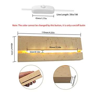 Show moreIlluminate your treasured creations with the JOJOCY 4 Packs LED Lights Base. Measuring at a versatile 4.33 x 1.57 inches, this elegant wooden display pedestal is designed to bring out the brilliance of your acrylic, plexiglass, and crystal glass art pieces. Crafted with high-quality rubber wood, the natural wood grain coupled with smooth, finely polished edges adds a touch of sophistication to your displays. Not only does it act as a captivating spotlight for your art, but it also doubles as a chic small desk lamp, making it a versatile addition to your home or workspace.