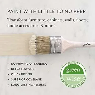 Show more Transform your living space with the exquisite Jolie Paint – Chalk Finish for Furniture, Cabinets, and Décor, a versatile and easy-to-use paint designed specifically for DIY enthusiasts and home decorators alike. This lightweight and elegant Uptown Ecru (Light Beige) shade perfectly suits various interior styles, adding a touch of sophistication to your furniture and décor items without the hassle of extensive prep work. Built on a foundation of quality, it's Green Wise Certified, ensuring that while your spaces look stunning, they are also safe for you and your family. This remarkable paint is known for its effortless application on a wide range of surfaces, making it the go-to choice for anyone looking to rejuvenate their home effortlessly.