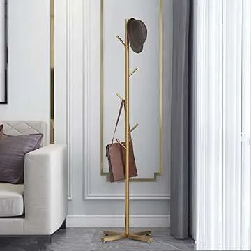 Jolitac Modern Metal Coat Rack in Gold Free Standing 7 Hooks Hall Tree in Corner, Hat Hanger & Coat Racks Stand Entryway Organizer for Clothes, Bags, Umbrella (Golden)