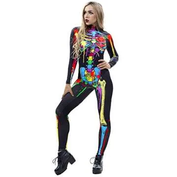 Show moreIntroduce the life of the party with the JomeDesign Womens 3D Skeleton Halloween Costume, a striking bodysuit that combines style and comfort in one colorful ensemble. Perfect for any festive occasion, this long-sleeve turtleneck jumpsuit features a unique 3D skeleton design that adds a playful yet spooky flair to your outfit. Designed with functionality in mind, the jumpsuit includes a convenient zipper at the back, allowing for easy dressing and undressing. Made from a high-quality, stretchy material, it offers a snug and flattering fit that enhances your silhouette and keeps you feeling comfortable all night long.