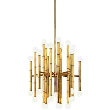 Show moreIlluminate your space with the breathtaking Jonathan Adler Meurice Collection 30-Light Brass Chandelier, a stunning centerpiece for any modern interior. Measuring 22 inches high and 19 1/4 inches wide, this exquisite chandelier marries elegant design with robust functionality. The chandelier's striking modern brass finish not only adds a touch of class but also complements various decor styles, making it a versatile choice for your home. Featuring styles you admire in Jonathan Adler’s designs, this chandelier radiates sophistication with its thirty light fixtures designed to hold maximum 25 watt candelabra globe bulbs. (Please note, bulbs are not included.) For easy installation, it comes with three 12-inch downrods and one 6-inch downrod, allowing you to customize your hanging height.