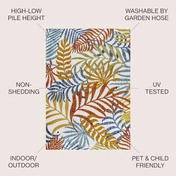 Show moreTransform your living space with the stunning JONATHAN Y AMC100B-8 Tropics Palm Leaves Indoor Outdoor Area-Rug. This beautiful rug is designed to bring a refreshing bohemian vibe to any area, whether it’s your kitchen, patio, porch, or backyard. Featuring a vibrant tropical color palette that includes fruity red, cheerful orange, sunny yellow, and calming blue, it’s an aesthetic piece that feels both lively and stylish.