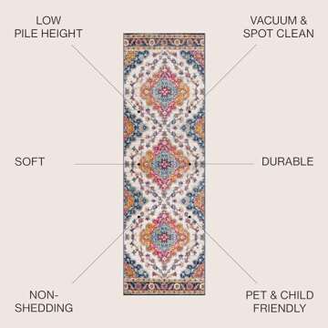 Show moreTransform your living space with the JONATHAN Y BMF106A-28 Bohemian Flair Boho Vintage Medallion Runner Rug. Measuring an elegant 2 ft. x 8 ft., this exquisite area rug seamlessly blends style and functionality for a sophisticated touch in any room. The vintage-inspired medallion pattern showcases a captivating palette of pink, blue, orange, and gold tones, offering a vibrant yet versatile accent for your bedroom, kitchen, or living room. Crafted from low-pile synthetic fibers, this rug is not only comfortable but also durable enough to withstand high-traffic areas, making it an ideal choice for homes with kids and pets. Experience the perfect fusion of comfort, design, and practicality with this stunning runner rug.
