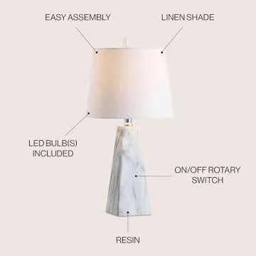 Show more Elevate your interior decor with the JONATHAN Y JYL1037A Owen 20.5" Resin LED Table Lamp, a harmonious blend of contemporary elegance and practical functionality. This stunning lamp, with its sophisticated white marble finish, is not just a light source but a statement piece that transforms your space. Encased in a durable ceramic base, the lamp features exquisite marble-effect glazing, ensuring it catches the eye without overpowering your existing decor. The 100% cotton shade provides a soft diffusion of light, creating a welcoming ambiance that invites relaxation. Perfectly aligning style with modern convenience, this lamp is designed to complement any room from the living room to the office. With its energy-efficient LED bulbs included, you’ll enjoy bright, long-lasting illumination while saving on energy costs.