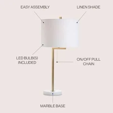 Show moreBrighten up your home with the stunning Jonathan Y Alyssa 24.5" Table Lamp. Perfectly blending style and functionality, this lamp is an ideal choice for contemporary interiors. Standing at a graceful 24.5 inches tall, it showcases a sleek marble base that not only provides exceptional stability but also adds a touch of elegance to any space. Designed specifically for today’s lifestyle, this lamp comes equipped with energy-efficient LED bulbs, ensuring you enjoy warm and inviting lighting without sacrificing power efficiency. You'll appreciate the seamless operation of the on-off pull chain switch, which makes it easier to use than traditional lamp switches.