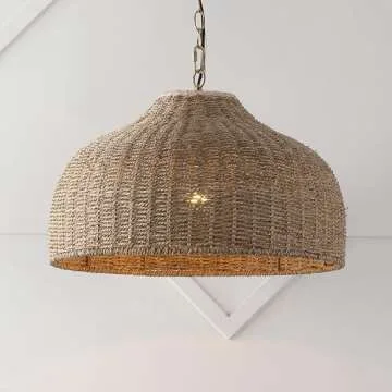 Show moreThe JONATHAN Y JYL1133A Eliza Pendant Light is a stunning centerpiece, perfectly melding **coastal charm** with modern functionality. Designed to elevate any space, its 20-inch dome shape is accentuated by a rich **brown rattan woven shade** that adds texture and warmth. The sleek **brass gold chain** not only enhances its visual appeal but also ensures durability and long-lasting use. This versatile pendant is ideal for various interior styles, including **rustic, cottage, farmhouse**, and even **Mediterranean** aesthetics, making it a wonderful addition to any living room, dining room, bedroom, hallway, or office.