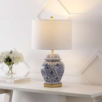 Show more The JONATHAN Y Table Lamp is not just a lighting solution; it's a statement piece that transforms the ambiance of any space. Crafted with a classic Chinese-inspired ginger jar shape, it elegantly combines tradition with modern design. The captivating blue and white damask finish paired with the refined brass base provides an aesthetic that fits seamlessly into various decor styles, from contemporary to classic.
