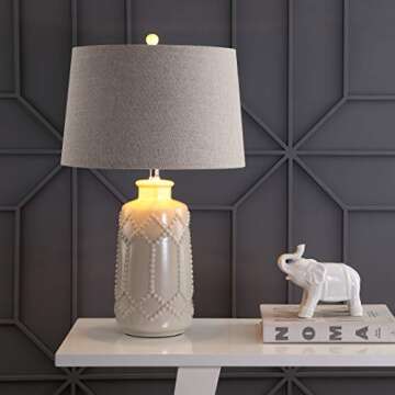 Show moreIlluminate your space with effortless elegance using the JONATHAN Y JYL4018A Alice 26" Ceramic LED Table Lamp. Perfectly blending contemporary design with transitional charm, this lamp boasts a stunning ceramic base with a distinctive bauble texture that adds depth and character to any room. Its beautiful cream finish complements diverse decor styles, making it a versatile addition to your bedroom, living room, or office. Not just a decorative piece, this lamp is designed with functionality in mind; it comes equipped with LED bulbs that last for years, ensuring both eco-friendliness and vibrant illumination. Enjoy the unique gold interior of the shade that casts a warm, inviting glow, elevating your home’s ambiance and garnering compliments from guests.