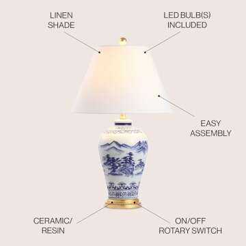 Show more Introducing the JONATHAN Y JYL6610A Zhou 26.5" Ceramic/Iron Traditional Cottage LED Table Lamp, a stunning piece that brings a touch of elegance and functionality to any space in your home. Crafted with an eye for detail, this lamp combines high-quality ceramic and iron construction, exuding a timeless aesthetic that harmonizes with various interior styles, from Hollywood Regency to Traditional Cottage. The lamp features a beautiful blue and white pattern, accentuated by a hardback fabric shade that offers a soft yet ample illumination. Perfect for your bedroom, living room, or office, this lamp fits seamlessly beside your bedside, on your desk, or even on a college bookcase, providing both style and practicality.