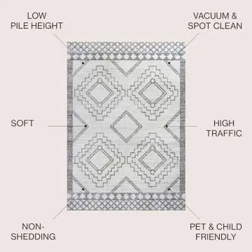 Show more Introducing the JONATHAN Y MOH200B-4 Amir Moroccan Beni Souk Indoor Area-Rug, a stunning addition to any room that seamlessly combines style, functionality, and ease of care. This beautifully crafted rug measures 4 x 6 feet and features a charming geometric pattern in a chic cream and gray color scheme, offering a modern twist on vintage Moroccan designs. Perfectly sized for bedrooms, kitchens, or living rooms, this rug showcases a low 0.39-inch pile, ensuring unparalleled comfort while maintaining a sleek profile that won't overwhelm your decor.