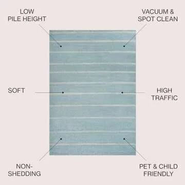Show more Introducing the JONATHAN Y MOH201B-8 Williamsburg Minimalist Stripe Area Rug, expertly crafted to elevate any space with its stunning turquoise and cream colors. This rug showcases a modern take on neutral and vintage tribal designs, making it an ideal choice for those who appreciate contemporary aesthetics. Made from 100% easy-care polypropylene, this beautiful area rug measures 8 x 10 feet and features a low pile height of just 0.39 inches, ensuring it fits perfectly in any room without overwhelming the decor. The thoughtfully designed no-backing construction allows for seamless placement, although a rug pad is recommended for added comfort and stability. Perfect for the living room, dining area, bedroom, or kitchen, this rug brings a touch of elegance and warmth to your home while being incredibly practical and durable.