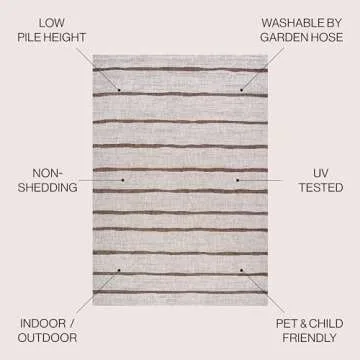 Show more Elevate your living space with the exquisite **JONATHAN Y SMB125A-5 Colonia Berber Stripe Indoor Outdoor Area Rug**, a perfect blend of style and practicality. Crafted from premium **low-pile synthetic fibers**, this rug is not only super soft underfoot but also incredibly durable, ready to withstand the demands of both indoor and outdoor living. Its versatile design makes it an excellent addition to any area in your home, be it the kitchen, patio, or deck. What sets this rug apart is its **resilience against UV fading** and its **stain-resistant** properties, making it a top choice for households with kids and pets. With its chic woven beige and brown color scheme, this rug harmonizes beautifully with any décor, instantly adding warmth and elegance to your ambiance.