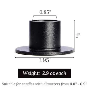 Show moreElevate your decor with the JONERAY 24 PCS Taper Candle Holders, the perfect fusion of style and functionality. Crafted from high-quality metal, each holder features a stunning black matte finish that not only enhances its aesthetic appeal but also ensures durability and longevity. Measuring at a compact 1 inch tall with a diameter of 1.95 inches, these candle holders are designed to hold taper candles ranging from 0.8 to 0.9 inches in diameter, making them a versatile choice for various settings. With 24 pieces in a single package, you’ll have more than enough to create an enchanting atmosphere for any occasion.