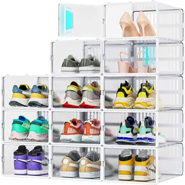 Introducing the **JONYJ 12 Pack Shoe Organizer** – your ultimate solution for shoe storage that combines functionality with elegance. These clear plastic stackable shoe boxes are ingeniously designed to provide ample space for organizing your footwear collection while ensuring that your shoes remain in pristine condition. Crafted from high-quality, durable PP plastic, these organizers are not only sturdy but are also breathable, preventing any undesirable odors from lingering in your shoes. With a dimension...