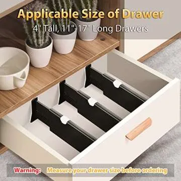Show moreTransform your disorganized drawers into a well-structured haven with the JONYJ Drawer Dividers Organizer 4 Pack. Each divider is ingeniously designed to provide a perfect combination of functionality and aesthetics, making them not just organizational tools, but also elegant additions to any space. Forget about flimsy separators; these robust dividers are built to last, crafted from premium materials that ensure a strong secure hold while effortlessly expanding from 11 to 17 inches to fit multiple drawer sizes. Their versatile 4-inch height makes them suitable for a variety of uses, from kitchen utensils to office supplies.