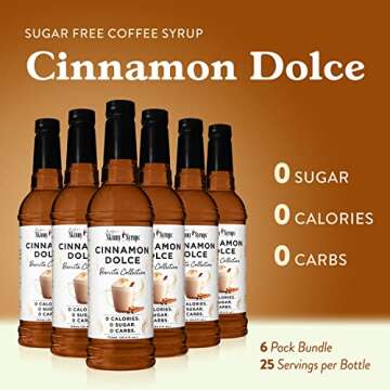 Show more Elevate your beverage experience with Jordan's Skinny Syrups Cinnamon Dolce Flavoring Syrup. This sugar-free drink mix adds a delightful blend of cinnamon and brown sugar flavor to your favorite drinks, making it perfect for morning coffee, chai lattes, and evening desserts. With an impressive zero calories, zero sugars, and zero carbs, you can indulge guilt-free anytime. Crafted with care in the USA, each syrup is gluten-free, kosher, keto-friendly, and non-GMO, making it suitable for various dietary preferences.