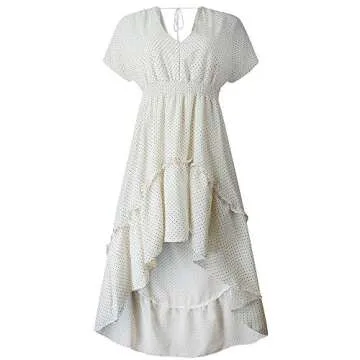 Joteisy Women’s V Neck Short Sleeves Tie Back Ruffled High Low Hem Maxi Dress (L, White Dot)