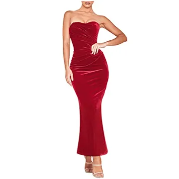 Show more Get ready to steal the spotlight with the Joukavor Women's Vintage Ruched Strapless Bodycon Dress, a stunning addition to your formal attire collection. Crafted from luxurious velvet, this dress not only offers an alluring aesthetic with its rich hue of red but also provides ultimate comfort. The sleeveless design and low-cut neckline exude confidence, while the ruched detailing enhances your silhouette, allowing you to showcase your curves beautifully. It's a dress that combines elegance with contemporary flair, making it a perfect choice for cocktail parties, formal events, and special occasions.