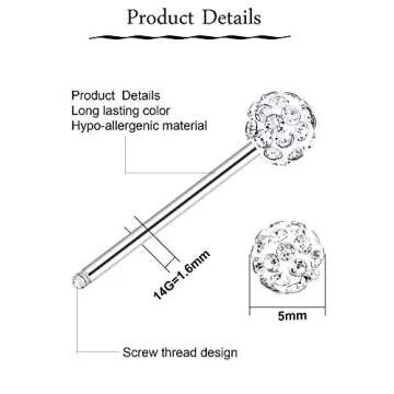 Show moreJOVITEC 2 Pairs Stainless Steel Nipple Ring CZ Barbell Rhinestone Nipple Studs are exquisite body piercing accessories designed to make a statement. Measuring at a bar thickness of 1.6 mm (14 G), with a 5 mm ball diameter and a ring length of 16 mm, these nipple rings are crafted for both style and comfort. Conformed to the highest standards of quality, these rings are made from lightweight, durable stainless steel that promises longevity without rusting or fading, ensuring they look as stunning after multiple wears as they did on day one.