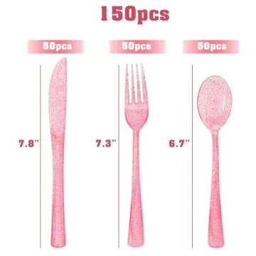 Show more Presenting a delightful set of Pink Utensils that will transform your dining experience into a picturesque celebration! Whether you're planning a formal event or a casual get-together, these pink plastic silverware pieces are designed to elevate the ambiance of any table setting. The sparkling pink exterior radiates warmth and romance, adding a cheerful and vibrant touch to your gathering. With a total of 150 pieces—50 forks, 50 spoons, and 50 knives—this cost-effective set ensures you’re well-prepared for any occasion.