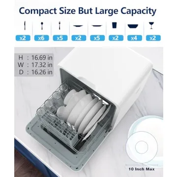 Show moreIntroducing the Joy Pebble Countertop Dishwasher, the perfect blend of power and compact design for those looking to optimize their kitchen experience! This modern dishwasher measures only 16.69 x 16.26 x 17.32 inches yet can effectively clean up to 28 pieces of dishes per cycle. Designed with versatility in mind, it includes six washing programs tailored to meet a variety of cleaning needs—from Eco to Intensive settings—making it suitable for household items, baby items, or even delicate glassware. Enjoy the peace of mind knowing you can wash up to five 10-inch plates, four bowls, and various cutlery without hassle. With a sleek LED touch screen, operating this machine is a breeze, offering you effortless access to its various features.