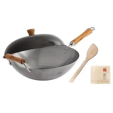 Show moreThe JOYCE CHEN Classic Series 14-Inch Uncoated Carbon Steel Wok Set is the ultimate tool for any home chef, designed to withstand high-temperature cooking for perfect culinary creations. Its innovative lightweight 1.5mm carbon steel gauge offers superior strength, while the flat bottom ensures stability on any stovetop. The set includes a lid and features solid birch wood handles for easy maneuvering, with a helper handle for added convenience. Perfect for stir-frying, searing, and more, this wok becomes reasonably non-stick with proper seasoning and care.