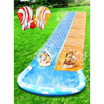 Equipped with two inflatable boards, the JOYIN slide allows for thrilling races with friends or siblings, and caters to multiple users at once. The splash pool at the end helps to ensure a soft landing, keeping your kids safe while they indulge in some exhilarating outdoor play. Setup is a breeze; simply roll it out, secure it with the included stakes, and connect the water hose. This effortless assembly means you can quickly get to the fun without the hassle of complicated instructions!