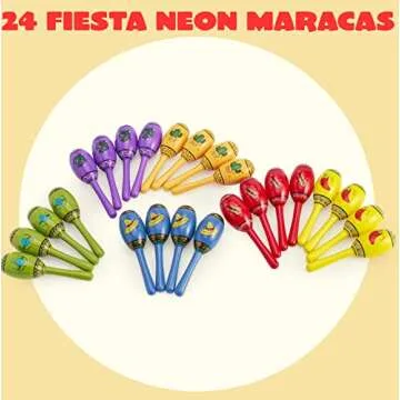 Show moreBring joy and vibrancy to your next celebration with the JOYIN 24 Mini Wooden Fiesta Maracas. This comprehensive set includes 24 beautifully crafted mini wooden maracas, featuring an eye-catching spectrum of six vibrant colors: red, orange, yellow, green, blue, and purple, with four maracas of each color. Perfectly sized for small hands, these maracas are ideal for children and adults alike, making them a versatile addition to any event. Whether you're hosting a Mexican fiesta, a Cinco de Mayo celebration, or a tropical luau, these maracas promise to enhance the party atmosphere with their festive sounds and bright hues. Crafted with care, they not only add charm to your decor but also provide hours of musical fun for guests of all ages.