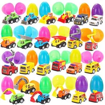 JOYIN 24 Pcs Filled Easter Eggs with Pull Back Construction Cars, Prefilled Easter Egg with Vehicle for Kid Boys, Basket Stuffers/Fillers, Party Favor, Classroom Prize Supplies