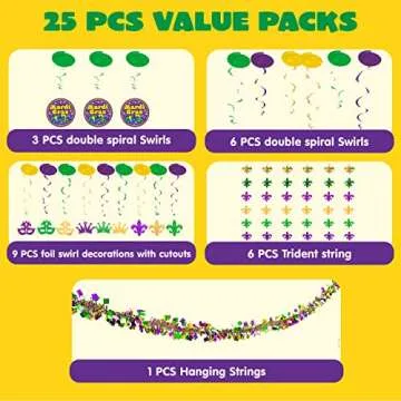 Show moreGet ready to transform your celebration into a vibrant spectacle with our JOYIN 25 PCS Assorted Mardi Gras-Themed Set, designed for those who want to impress their guests with eye-catching decorations. This super value pack comes equipped with a delightful assortment of hanging swirls that echo the festive colors of Mardi Gras—Gold, Green, and Purple—that embody jubilation and fun! The complete set includes 6 elegant hanging swirls, 3 swirls adorned with cards, 9 charming swirls featuring festive masks, crowns, and tridents, alongside 6 packs of hanging trident strings, and a stunning tinsel garland available in three dazzling colors. This unique combination ensures your space is transformed into a festivity-filled atmosphere.