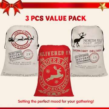 JOYIN 3 PCS Santa Burlap Sack present Bags with Drawstring 26" x 19" for Large Xmas Package Storage, Event Party Supplies, Christmas Party Favors.