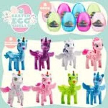 Show more This delightful set of Pre-filled Easter Eggs is an enchanting gift that will captivate children of all ages. Included are 8 jumbo Easter eggs each filled with a colorful and fun unicorn toy. Designed with a unique twist, these unicorns showcase movable accessories, allowing kids to rotate and assemble their wings with ease. Just twist and fold them back into their eggs for convenient storage, ensuring endless hours of imaginative play!
