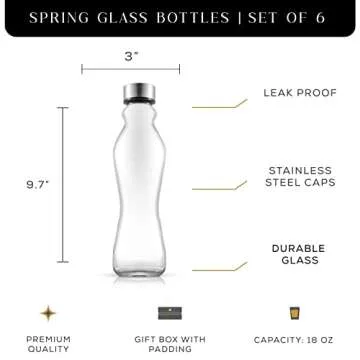 Show moreIntroducing the JoyJolt Spring Glass Water Bottles, a set of 6 elegant and reusable 18 oz vessels designed for the hydration-conscious individual. Crafted from 100% pure glass, these Spring glass bottles are your perfect companions for staying refreshed, whether at home or on the go. Measuring 2.75 inches wide and 10 inches tall, each bottle weighs only 10 ounces when empty, making them both lightweight and sturdy enough for everyday use. The unique hourglass design allows for a comfortable grip, providing ease and style as you sip from your favorite beverages.