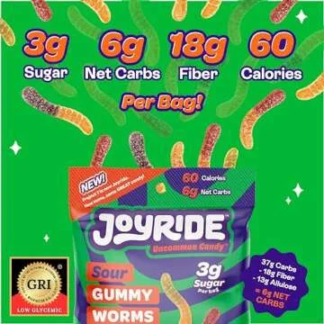 Show more Introducing JOYRIDE's new sugar free candy – keto gummies crafted by the candy connoisseurs at Project 7. Experience snacking delight with our sugar free gummy candy. Each 1.8oz bag of sour sugar free gummy worms has only 6g net carbs and 80 calories, making them the perfect keto snacks to indulge without compromising on taste. Elevate your snacking experience with JOYRIDE sugar free candy. We Cracked The Candy Code: Other sugar free candy or keto candy brands will claim they have low carbs, but each pack of JOYRIDE sugar free gummy worms has only 6g net carbs and 20g of fiber. These keto-friendly, low-calorie snacks deliver a burst of flavor without the sugar or carb overload. Treat yourself and discover joy in every bite with these delicious sugar free snacks. Creatively Crafted with Better For You Ingredients: Made with 100% plant-based ingredients, JOYRIDE is a pioneer of plant-based snacks, and we are proud to be the first keto sweets brand with a line of completely vegan snacks. Enjoy your childhood favorite sour candy and gummies candy made from sustainable ingredients you can feel good about. Uncommon Candy with Magically Mighty Macros: Fuel your keto lifestyle with JOYRIDE sugar free gummies. Low in carbs, high in taste, these keto gummies are the perfect solution for your cravings. Experience the joy of satisfying your sweet tooth while staying on track with your goals. Elevate your snacking game with our keto snacks in this delightful variety pack of low carb candy. Leaving Sugar in the Rear View Mirror: High in fiber and low in net carbs, these keto friendly snacks are the healthy candy option. Our sugar free gummies are a low calorie candy option that has the bonus of high fiber with 20g per bag. Perfect for anyone looking for low sugar snacks that are also good for their digestive health.