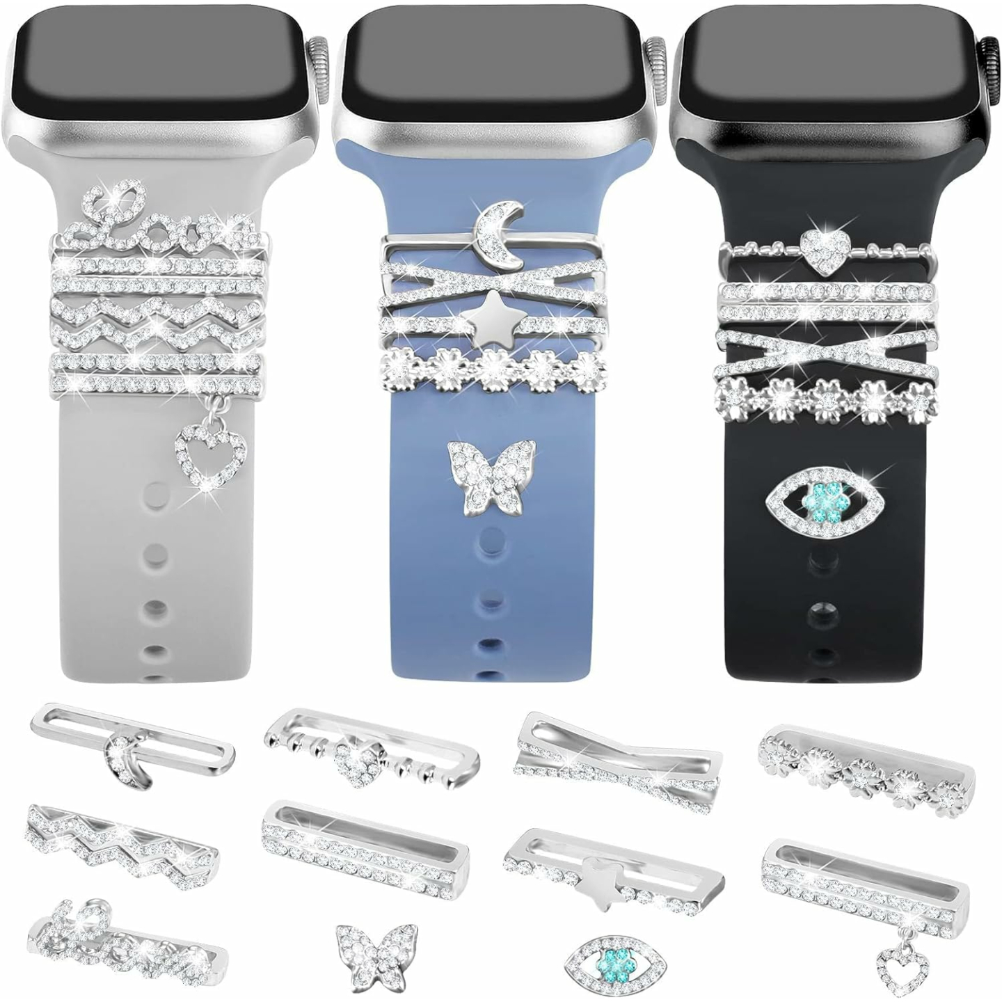 The set includes 11 meticulously crafted charms, featuring high-quality metal and diamond elements. These are designed for durability and long-lasting shine. The charms can be easily slid onto the watch strap, ensuring a secure fit without any hassle. Their universal compatibility with all iWatch Series makes them extremely versatile and user-friendly.