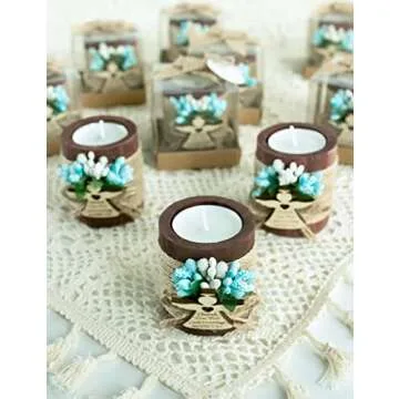 These wooden candlestick holders are more than just decorative items; they are the ideal personalized keepsakes for various occasions. Whether it’s a boy's baby shower, a first communion celebration, or a baptism event, these tealight holders create a heartwarming ambiance that enhances your gathering. The delicate blue flower decorations add a touch of sophistication, while their thoughtful design ensures they stand out on any table setting.