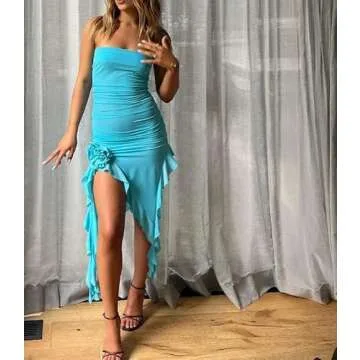 Juakoso Sexy Y2K Ruffles Fairy Dress Fringe Strapless Floral Dress Asymmetrical See Through Beach Party Club Outfits, Blue 2