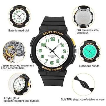 Juboos Kid's Analog Watch for Boys and Girls, Outdoor Sports 5 ATM/ 50M Waterproof Childrens Watch with Light, Easy-to-Read Time Teaching Large Dial