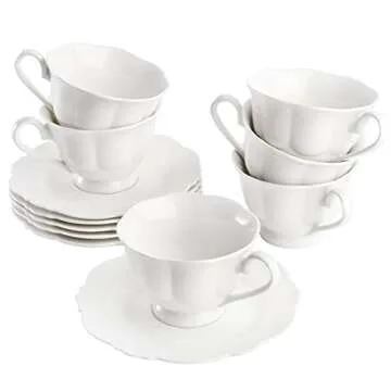 Show more Introducing the Jucoan Set of 6 Porcelain Tea Cups and Saucers, a stunning collection designed to enhance your tea-drinking experience. Crafted from high-quality bone china, this set embodies elegance and durability, making it a perfect addition to your kitchen or coffee and tea station. Each cup holds 6 oz and measures 3.75 x 2.5 inches, accompanied by matching saucers with a 6-inch diameter. The chic, floral-shaped design makes these tea cups a stylish choice that stands out while offering the classic feel of traditional British tea ceremonies. Whether it’s a casual afternoon with family or a more elaborate gathering with friends, these tea cups elevate every moment you spend sharing delightful drinks.