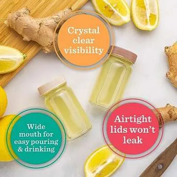 Juice Shot Containers, Glass, Clear, 2oz, Colored Lids & Silicone Grip Bands, Beverage Storage, Juicing, Ginger & Turmeric Bottles