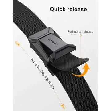 Show more Introducing the JUKMO Stretch Tactical Belt—a masterful blend of strength, comfort, and functionality designed to accompany you on all your adventures. Crafted from high-quality stretch nylon, this 1.5" military-grade belt ensures that no matter your endeavor, whether it's hiking, tactical missions, or daily work, you'll enjoy a superior fit that adapts to your movements. The innovative upgraded quick-release buckle is made from durable zinc alloy, allowing for effortless one-handed operation, making it a reliable companion in both emergency situations and everyday wear.