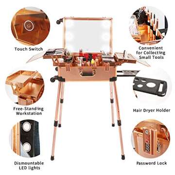 Inside, the case reveals four removable storage trays and several compartments, allowing you to organize all your makeup essentials efficiently. Made from high-quality aluminum and MDF, this case can withstand the rigors of professional use while still looking elegant with its rose gold finish. The included 3-code password lock adds a layer of security, ensuring your beauty treasures are safe.