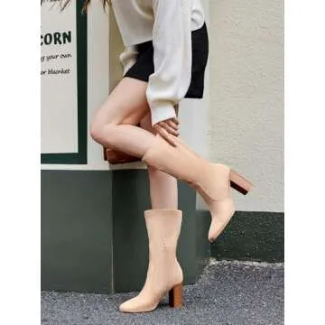 Juliet Holy Women’s Mid-calf Boots Chunky Stacked Heel Square Toe Side Zipper Slip-on Suede Winter Booties